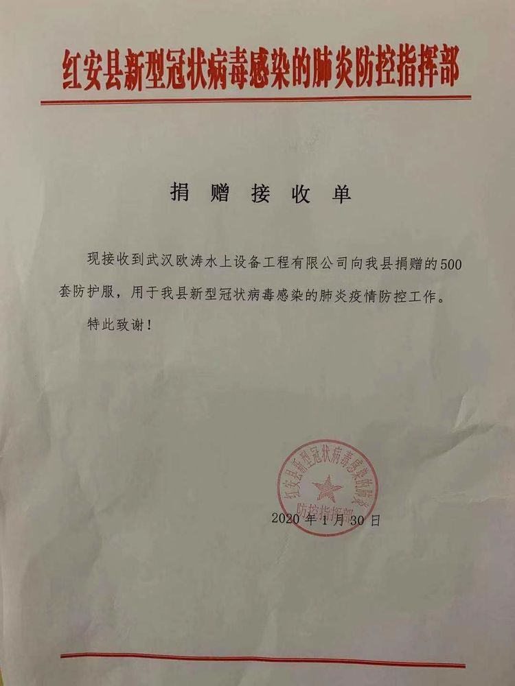 作为土生土长的红安人,陈劲松总经理代表武汉欧涛水上工程设备有限公司向红安县防疫指挥部,红十字会捐赠一大批急需防疫物资,得到了县委,县政府,县防控指挥部的高度认可,他个人和企业捐款捐物折合共计6万余元。