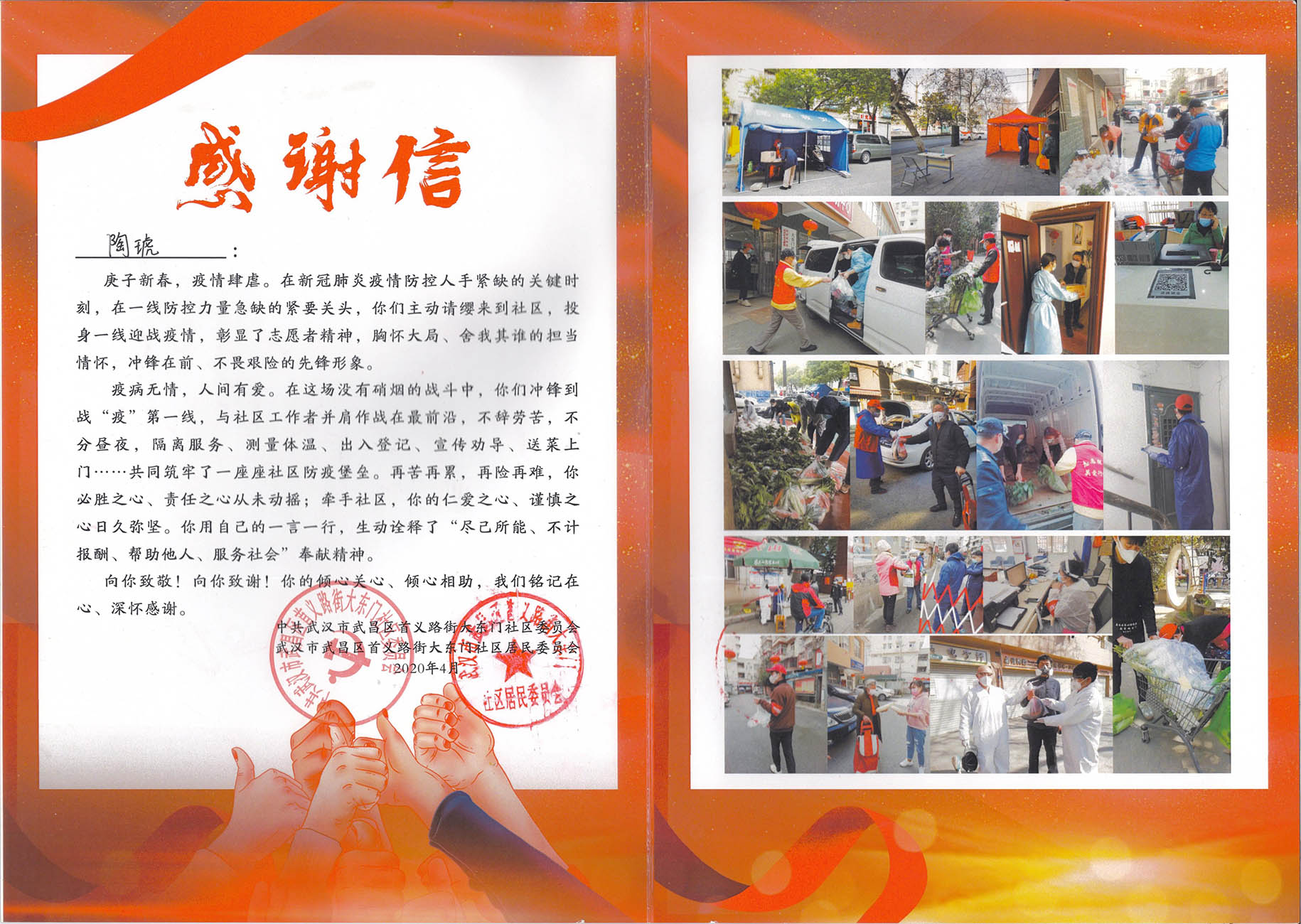 在本次疫情的防疫,抗疫工作中,涌现出一大批有家国情怀,有担当的青年志愿者作为我司职员陶琥,就是这样一位社区防疫志愿者。在社会急需志愿者的时刻,陶琥怀着奉献社会、锻炼自我的心态,毅然成为了所在社区的志愿者。有一分热,发一分光就 像萤火一般,也可以在黑暗里发一点光,不必等候炬火。