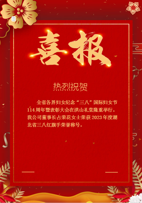 全省各界妇女纪念“三八”国际妇女节114周年暨表彰大会在洪山礼堂隆重举行。我公司董事长占荣花女士荣获2023年度湖北省三八红旗手荣誉称号。
